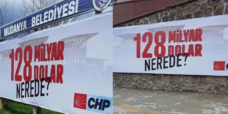 CHP Mudanya İlçe Başkanlığı’nın ilçedeki billboardlara astırdığı “128 milyar dolar nerede?” afişleri gece yarısı sökülürken, aynı afişler şimdi de soruşturma konusu oldu.