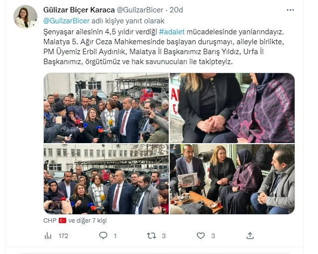 Dava hakkında bilgileri sosyal medya hesabında paylaşan CHP Genel Başkan Yardımcısı Gülizar Biçer Karaca, “Şenyaşar ailesinin 4,5 yıldır verdiği adalet mücadelesinde yanlarındayız. Malatya 5. Ağır Ceza Mahkemesinde başlayan duruşmayı, aileyle birlikte, PM Üyemiz Erbil Aydınlık, Malatya İl Başkanımız Barış Yıldız, Urfa İl Başkanımız, örgütümüz ve hak savunucuları ile takipteyiz” ifadelerini kullandı.