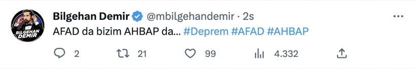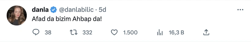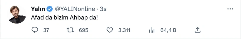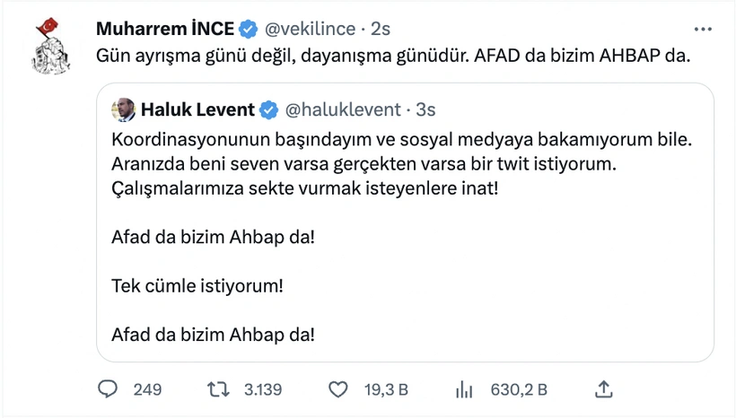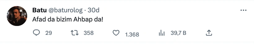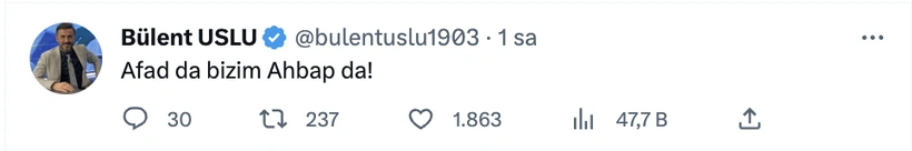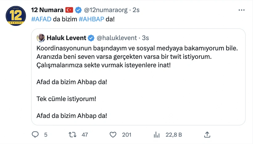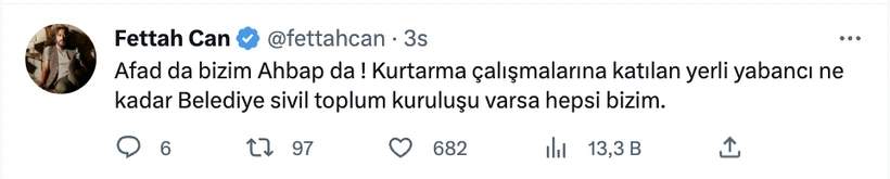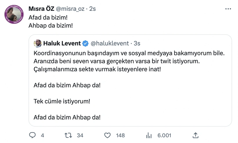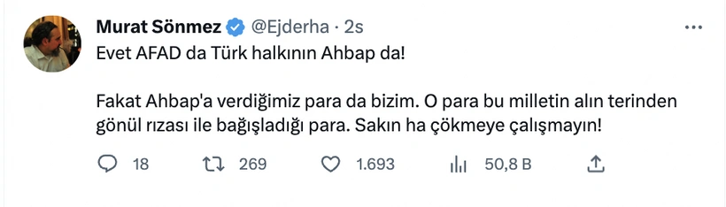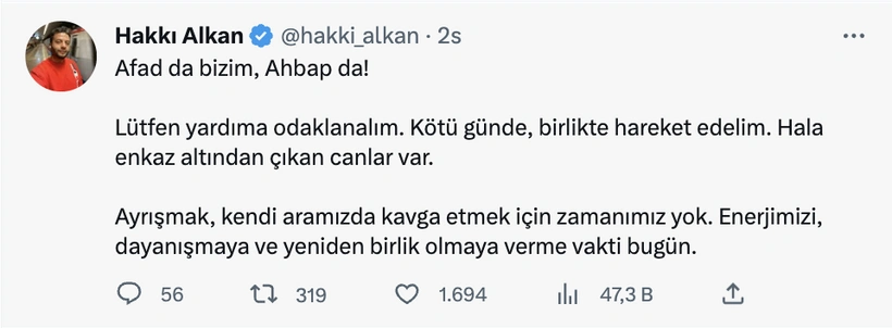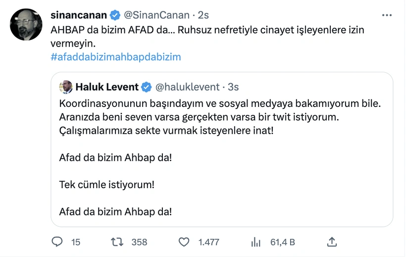 “Çalışmalarımıza sekte vurmak isteyenlere inat. AFAD da bizim Ahbap da! Tek cümle istiyorum! AFAD da bizim Ahbap da.”