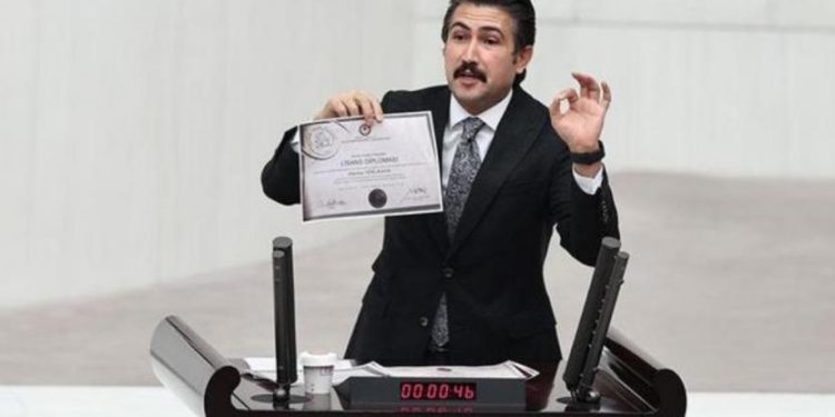 Bu sözlere AKP adına yanıt vermek için söz alarak kürsüye gelen AKP Grup Başkanvekili Cahit Özkan, Yerlikaya’ya ait olduğunu belirttiği lise diplomasını, Burdur Eğitim Fakültesi diplomasını ve yüksek lisans diplomalarını gösterdi.