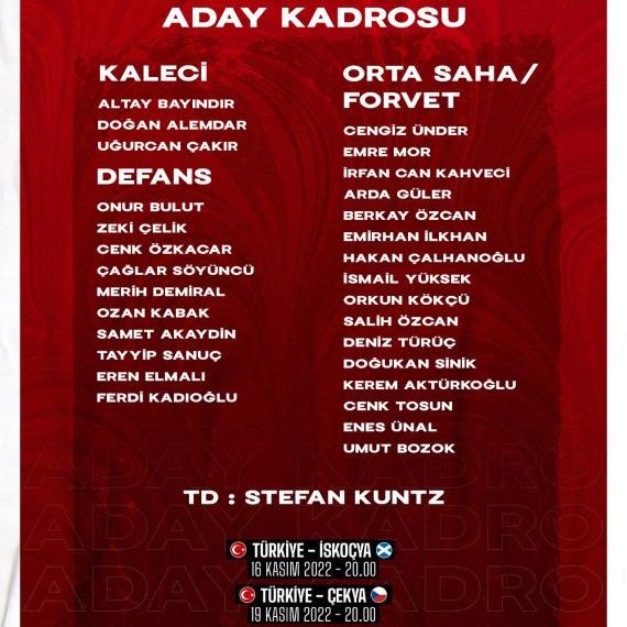 A Milli Futbol Takımımızın Çekya ve İskoçya ile oynayacağı hazırlık karşılaşmalarının aday kadrosu açıklandı.