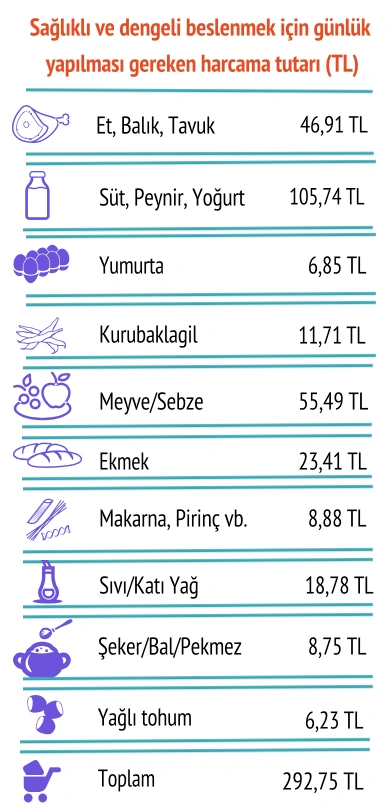 Raporda her aile ferdinin alması gereken kalori miktarı ve bunun maliyeleri de hesaplandı. Bu hesaplamalara göre yetişkin bir erkeğin sağlıklı ve dengeli beslenmesi için tüketmesi gereken gıdaların aylık karşılığı 2.385 lira. Bu değer yetişkin bir kadın için 2.276, 15-18 yaş bir genç için 2.471, 4-6 yaş arası bir çocuk için 1.651. Eğitim, sağlık, barınma, eğlence, ısınma, ulaşım gibi giderler ile birlikte bir ailenin yapması gereken harcama tutarı aylık 30 bin 379 liraya ulaşıyor.