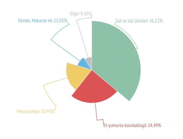 Günlük harcamalarda Ocak 2023’de en yüksek maliyet grubunu 106 lira ile süt ve süt ürünleri grubu oluşturdu. Et, tavuk ve balık grubu için yapılması gereken günlük minimum harcama tutarı 41.76 lira olurken sebze ve meyve için yapılması gereken günlük harcama tutarı ise 47 lira, ekmek için 23.4 lira, katı yağ ve sıvı yağ için ise 19 lira olarak saptandı. Ailelerin yumurta için 6.9, şeker, bal, reçel ve pekmez için ise 8,8 lira harcama yapması gerekti.