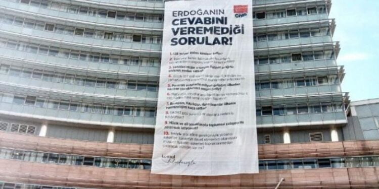 CHP Genel Merkez binasında bugün büyük bir afiş dikkat çekti. Binaya asılan afişte 'Erdoğan'ın Cevabını Veremediği Sorular' başlığı altında 10...