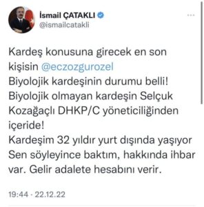 Özel’in bu sorusuna sosyal medyadan yanıt veren İçişleri Bakan Yardımcısı Çataklı, kardeşi hakkındaki “ihbardan”, yeni haberdar olduğunu öne sürdü. Çataklı, “Kardeş konusuna girecek en son kişisin Özgür Özel. Biyolojik kardeşinin durumu belli! Biyolojik olmayan kardeşin Selçuk Kozağaçlı DHKP/C yöneticiliğinden içeride! Kardeşim, 32 yıldır yurt dışında yaşıyor. Sen söyleyince baktım, hakkında ihbar var. Gelir, adalete hesabını verir” ifadesini kullandı.