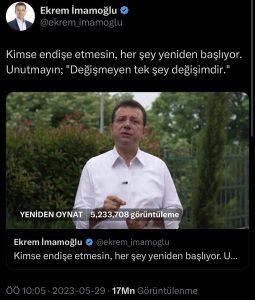 Ekrem İmamoğlu’nun 2023 seçimlerinin hemen ardından 29 Mayıs 2025 tarihli “Değişim” temalı canlı yayınını anlık 5 milyondan fazla kişi izlemiş, paylaşım 17 milyon kişi tarafından görüntülenmişti.