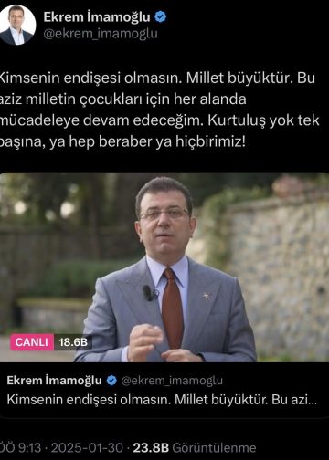 Yarın ki ifadesinden önce bugün X hesabı üzerinden canlı yayında açıklamalarda bulunan İmamoğlu’nun bu açıklamaları gerçekleştirdiği esnada canlı yayına katılımın beklentilerin oldukça altında kalan düşük bir sayıda gerçekleşmesi dikkat çekti. İmamoğlu’nun açıklamalarını anlık olarak sadece 18 bin 600 kişi izlerken, paylaşımın görüntüleme rakamı ise 23 bin 800’de kaldı.