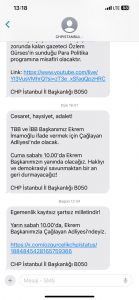 Yaşanan bu durum İstanbul CHP İl Örgütü’nü de harekete geçirdi.İstanbul İl Örgütü canlı yayının hemen akabinde İstanbul’daki CHP üyelerine yarın İmamoğlu’nun ifadesi esnasında kendisine destek olmak için Çağlayan Adliye’ye gelinmesi için tek tek SMS göndererek çağrıda bulundu.