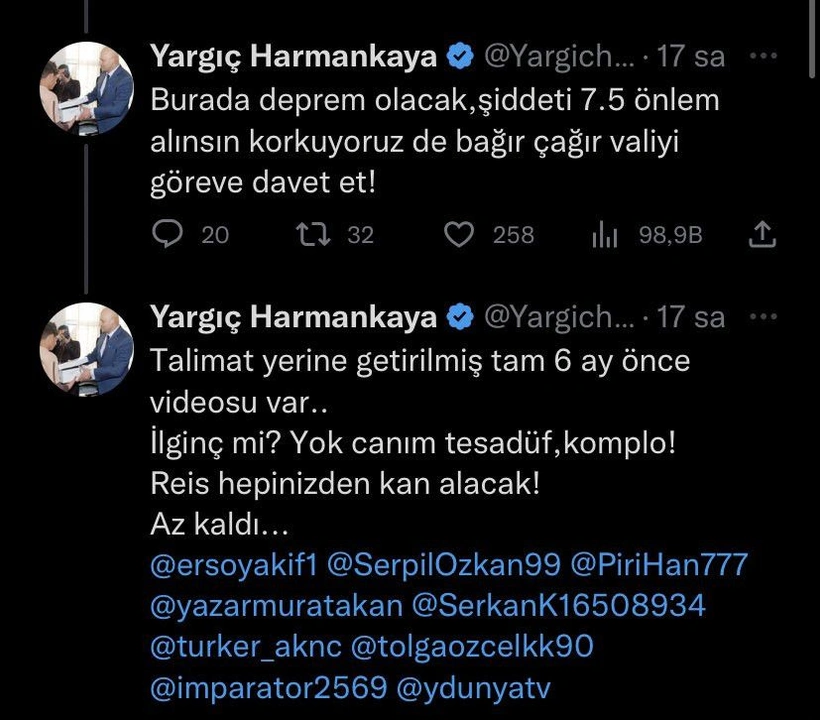 Daha sonra İYİ Parti Kahramanmaraş İl Başkanı Ahmet Çabukel’in Ağustos 2022’de deprem tehlikesine dikkat çekmek için yaptığı “7.0 şiddetinin üstünde iki deprem bekleniyor, hazır değiliz!” konuşmasını hedef alan Yargıç Harmankaya, İYİ Parti lideri Meral Akşener’e depremin 6 ay önceden haber verildiği komplo teorisiyle tepki çekti: