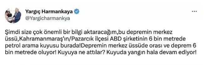 11 Şubat’ta Twitter’da mesajlar yayınlayan Yargıç Harmankaya, depremin Kahramanmaraş’ta ABD’nin petrol arama şirketi aracılığı ile fay hattında patlama meydana getirildiğini ve asıl hedefin İstanbul olduğunu iddia etti: