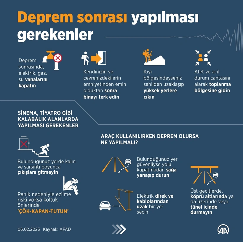Deprem sonucu meydana gelen can kayıplarını önlemek için öncesinde alınması gereken tedbirlerle birlikte afet esnasında ve sonrasında yapılması gereken birçok eylem bulunuyor: