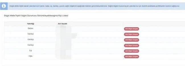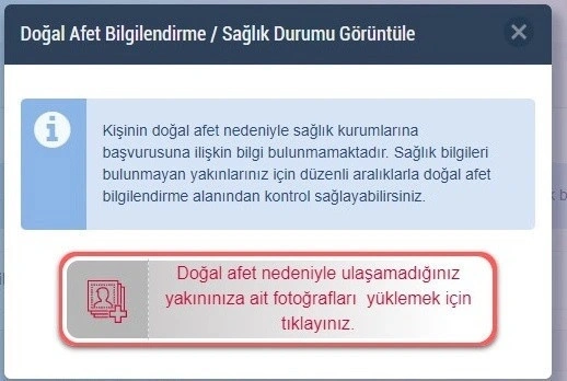 Düzenlemeyle Doğal Afet Bilgilendirme alanına kullanıcılar deprem nedeniyle ulaşamadıkları 1. ve 2. derece yakınlarına ait fotoğrafları yükleyerek ihbarda bulunabilecek.