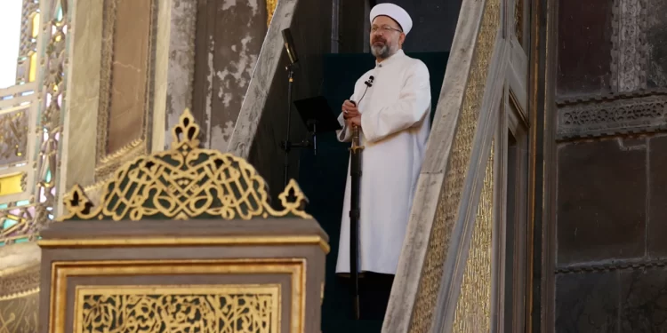 Ayasofya’nın camiye dönüştürülmesiyle kılınan ilk Cuma namazının ardından elinde kılıçla hutbe okuyan Diyanet İşleri Başkanı Ali Erbaş, Ayasofya’da yine kılıçla hutbe okudu.