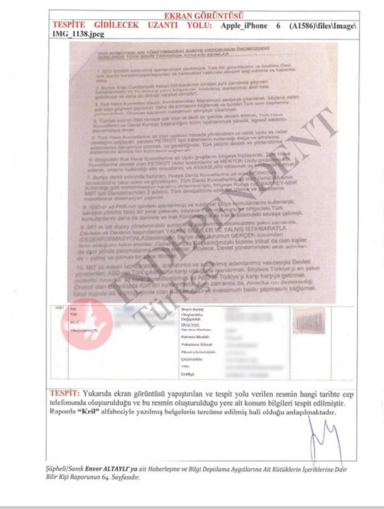 Altaylı, telefonundan çıkan Rusya Federasyonu İstihbarat Teşkilatı (FSB) Başkanı Alexander Bortnikov’a sunulmak üzere, FSB Müdür Yardımcısı General Sirotkin Gennadyeviç tarafından Türkiye’nin istikrarsızlaştırılması için hazırlandığı belirtilen raporla ilgili de savunma yaptı.