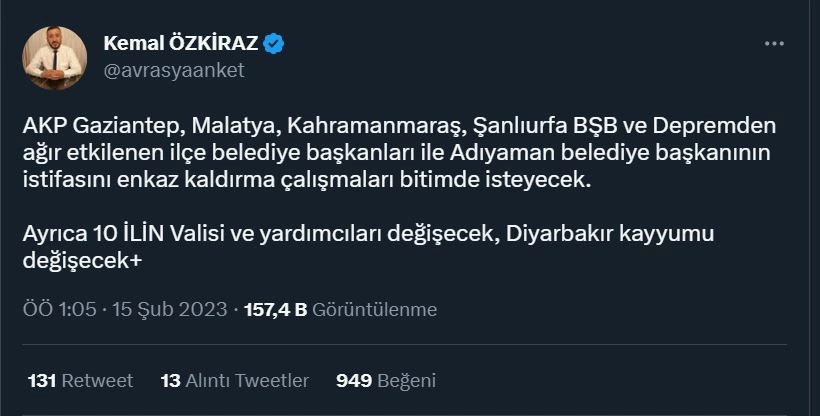Özkiraz’ın iddiasına göre; Erdoğan Gaziantep, Malatya, Kahramanmaraş, Şanlıurfa Büyükşehir Belediye Başkanları ve depremden ağır etkilenen ilçe belediye başkanları ile Adıyaman belediye başkanının istifasını enkaz kaldırma çalışmaları bitimde isteyecek. Öte yandan Diyarbakır’ın da kayyumu değişecek.