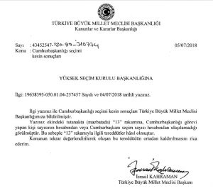 Bunun üzerine dönemin TBMM Başkanı İsmail Kahraman 5 Temmuz 2018’de YDK Başkanlığına bir yazı yazdı. Kahraman, “13 rakamına, Cumhurbaşkanlığı görevi yapan kişi sayısı hesabından veya seçim sayısından ulaşılamadığı görülmüştür” diyor “konunun tekrar değerlendirilerek oluşan tereddüdün kaldırılmasını” istiyordu.