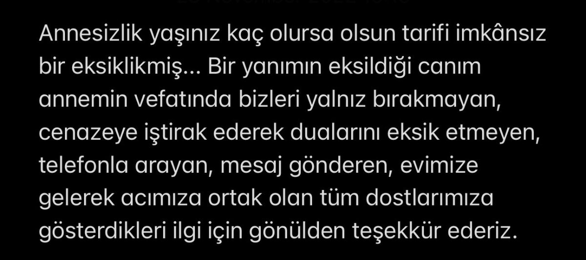 Geçtiğimiz günlerde annesini kaybeden deneyimli teknik adam paylaşımında, “Annesizlik yaşınız kaç olursa olsun tarifi imkansız bir eksiklikmiş. Bir yanımın eksildiği canım annemin vefatında bizleri bırakmayan, dualarını eksik etmeyen acımıza ortak olan tüm dostlarımıza teşekkür ederiz.” ifadelerini kullandı.