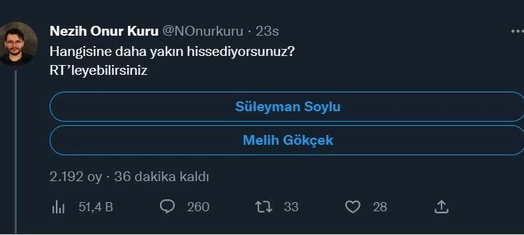 Gerçek Gündem yazarı Siyaset Bilimci Nezih Onur Kuru’nun sosyal medya hesabından paylaştığı ankette “Hangisine daha yakın hissediyorsunuz?” sorusunu sorması ve seçeneklere Melih Gökçek ile Süleyman Soylu’yu eklemesi ortalığı karıştırdı.