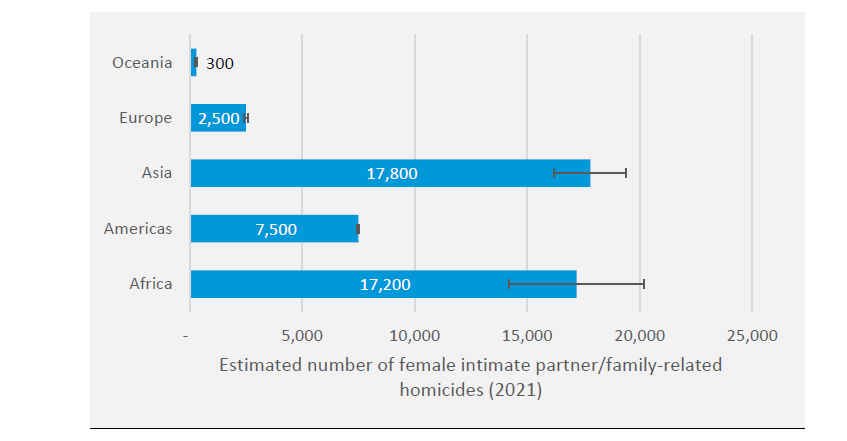 * Kadın cinayetlerinin en çok görüldüğü kıta 17 bin 800 kadın cinayeti ile Asya olurken, bunu Afrika 17 bin 200 kadın cinayeti ile izledi. Amerika kıtasında 2021 yılında tahminen 7 bin 500 kadın ve kız çocuğu yakın partneri ya da diğer aile üyeleri tarafından öldürülürken, Avrupa’da bu rakam 2 bin 500 olarak gerçekleşti.