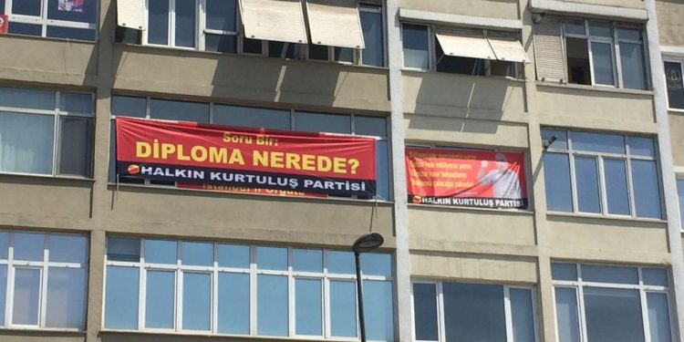 Halkın Kurtuluş Partisi (HKP) İstanbul ve İzmir İl Örgütü binasına “Soru Bir: Diploma Nerede?” yazılı pankart asıldı.