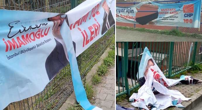 Yerel seçimlere sayılı günler kala İstanbul Sarıyer’de yeni bir provokasyona imza atıldı. İBB Başkanı Ekrem İmamoğlu ve Sarıyer Belediye Başkan Adayı Mustafa Oktay Aksu’nun seçim afişleri tahrip edildi. Yaşanan olay CHP’lilerin tepkisine neden oldu.