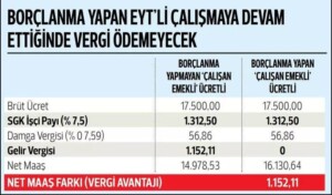 Emekli olacak EYT’lilerde aranacak şartlar: İlk işe girişin 8 Eylül 1999 öncesi olması, 20 yıl (kadın için) ve 25 yıllık (erkek için) sigortalılık süresinin olması ve en az 5.000 gün SGK’ya prim ödenmiş olması… EYT’lilerden bazıları; diğer iki koşulu sağlamış olsa da, henüz 5.000 günlük prim ödemesi koşulunu yerine getirmemiş olabiliyor. Bu 5.000 prim günü koşulunu sağlayamayanlar, askerlik veya doğum borçlanması yoluyla da eksik günlerini 5.000 güne tamamlayabiliyorlar. SGK’ya askerlik veya doğum prim borçlanması yapıp çalışmaya da devam edecek EYT’liler diğer yandan vergi avantajı da elde ediyorlar. Borçlanma prim (ödeme) tutarlarını gösterir belgeleri işverenlerine veren çalışanlar, ücret bordrolarında borçlanma tutarlarının vergi matrahlarından düşüldüğünü görecekler. (Gelir Vergisi Kanunu Md. 63/2) Dolayısıyla bordrolarında (borçlanma tutarına bağlı olarak) vergi hesaplanmadığını da görecekler. Emeklilikten sonra çalışmaya devam eden (borçlanan) EYT’lilerin, bordrolarında vergi görünmediğinden bu kez net maaşları da (vergi kadar) kendiliğinden artmış olacak.