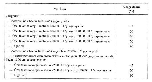 * 1600 cc altı otomobillerde vergiler dahil satış fiyatı 594 bin 722 liranın üstünde olan otomobillerin fiyatında herhangi bir değişiklik olmazken yüzde 45 ÖTV oranı için esas alınan ÖTV matrah eşiğinin 120 bin liradan 184 bin liraya çıkarılmasıyla vergiler dahil satış fiyatı 212 bin 401-369 bin 104 lira arasında olan otomobillerin fiyatının 7 bin ila 54 bin lira arasında düşmesi,