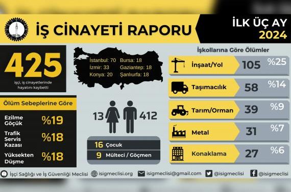 İşçi Sağlığı ve İş Güvenliği (İSİG) Meclisi, 2024 yılı ocak, şubat ve mart ayına ilişkin iş cinayetleri raporunu Rapora göre, ocak ayında 161, şubat ayında 149, mart ayında 115, 2024 yılının ilk üç ayında ise en az 425 işçi çalışırken hayatını kaybetti.