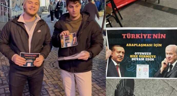 Üzerinde Cumhurbaşkanı Erdoğan ve MHP lideri Bahçeli’nin fotoğraflarının bulunduğu “Türkiye’nin Araplaşması için oyunuzu bize vermeye devam edin” yazılı broşürleri dağıtan İYİ Parti İstanbul Gençlik Kolları üyesi 3 genç gözaltına alındı.