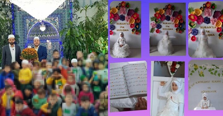 Videolar arasında en çarpıcı olanlar ise çocuklara yaptırılan ‘Amin Alayı’. Okula ilk defa gelen çocuklara yapılan törende kız çocuklarına gelinlik giydirilirken diğer çocukların etrafında oturduğu görülüyor.
