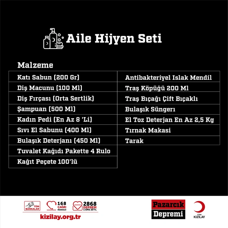 Giyim ve hijyen malzemelerine de çok ihtiyaç olduğunu belirten Kızılay, özellikle depremzedeleri sıcak tutacak eşofman, pijama, ayakkabı, çorap, mont/kaban ve günlük kıyafet bağışlarına dikkati çekti. Sabun, şampuan, diş fırçası ve macunu, tıraş bıçağı, tırnak makası, ıslak mendil, hijyenik ped, cımbız, tuvalet kağıdı, kağıt havlu, deterjan gibi ürünlerin yer aldığı hijyen paketi ve aile hijyen setlerini listeye eklendi.