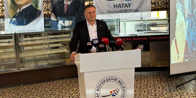 Lütfü Savaş, Hatay Büyükşehir Belediyesi Habibi Neccar Sosyal Tesisleri’ndeki basın toplantısında konuşuyor.
