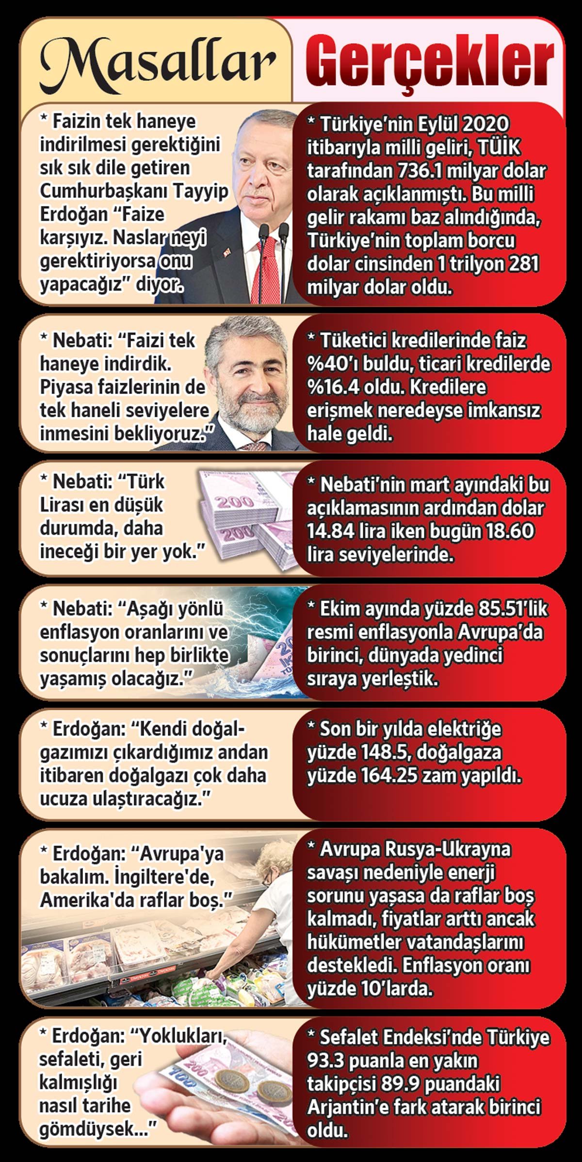 Erdoğan, “Faize karşıyız. Naslar neyi gerektiriyorsa onu yapacağız” dedi, faiz ödemeleri rekor kırdı. Faiz yüzde 9’a indirildi, Nebati, “Piyasa faizlerinin de tek haneli seviyelere inmesini bekliyoruz” dedi, tüketici kredileri yüzde 40’a varan, ticari krediler yüzde 16’yı aşan faiz oranlarına ulaşırken krediye erişim de zorlaştı. Nebati’nin doların 14.84 lira olduğu martta “Türk Lirası en düşük durumda, daha ineceği bir yer yok. Vatandaş rahat olsun” açıklamasının ardından dolar 18.60 liralara çıktı. Nebati ocak ayından bu yana enflasyonda düşüş yaşanacağını söylese de aksine tarihi rekorlar kırdı, ekimde TÜİK’e göre yüzde 85.51’e çıktı, ENAG’a göre ise yüzde 185’i aştı. Erdoğan, Karadeniz’de bulunan doğalgaz rezerviyle “Kendi doğalgazımızı çıkardığımız andan itibaren vatandaşımıza doğalgazı çok daha ucuza ulaştıracağız” dese de itiraf Enerji ve Tabii Kaynaklar Bakanı Fatih Dönmez’den geldi. Dönmez, “İlk fazda mutfakta kullanılan gazı karşılayacak!” dedi. Mutfak tüpünü dahi dolduracak ucuz gaza henüz ulaşamadığımız gibi son 1 yılda doğalgaz ve elektriğe üst üste zam geldi.