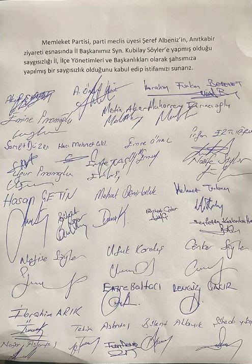 Açıklamada “Memleket Partisi, parti meclis üyesi Şeref Albeniz’in, Anıtkabir ziyareti esnasında İl Başkanımız Syn. Kubilay Söyler’e yapmış olduğu saygısızlığı İl, ilçe Yönetimleri ve Başkanlıkları olarak şahsımıza yapılmış bir saygısızlık olduğunu kabul edip istifamızı sunarız.” ifadelerini kullandı.