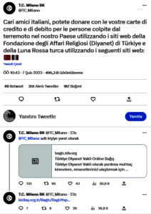 Türkiye’nin Milano Başkonsolosluğu, dün sosyal medya hesabından yaptığı paylaşımda, 6 Şubat’ta merkez üssü Kahramanmaraş olan ve 10 ili etkileyen depremin ardından, İtalya vatandaşlarına depremzedelere yardım göndermeleri için Türkiye Diyanet Vakfı’na bağış yapmaları çağrısında bulundu.