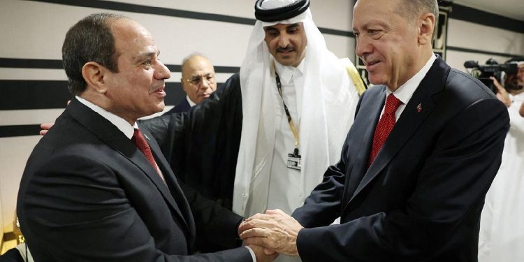 Cumhurbaşkanı Recep Tayyip Erdoğan, Katar’ın başkenti Doha’da Mısır Cumhurbaşkanı Sisi ile görüşüp el sıkıştı.