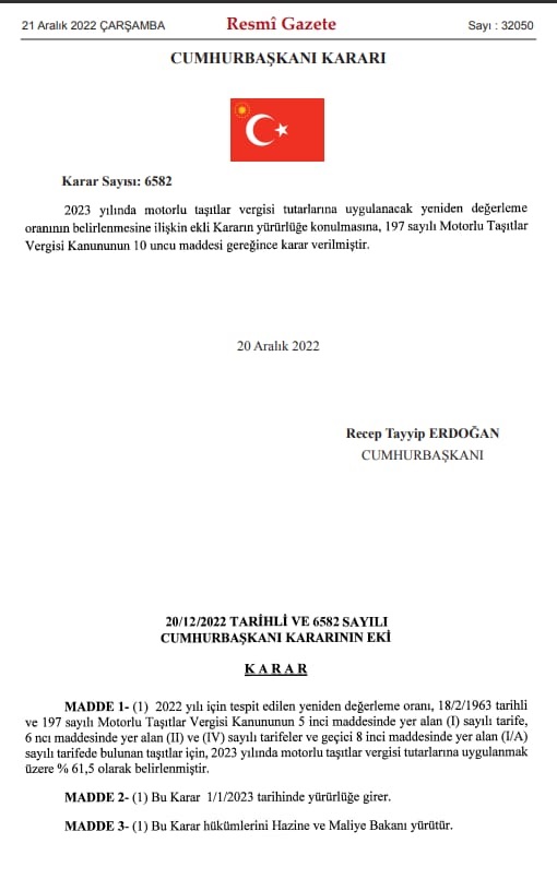Resmi Gazete’de yayımlanan karara göre MTV zammı 2023 yılında yüzde 61,5 olarak uygulanacak.