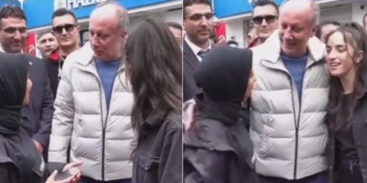 Esnaf ziyareti gerçekleştirdikten sonra Cumhuriyet Caddesi’nde yurttaşlarla bir araya gelen İnce, gençlerle fotoğraf çekildi. Ancak İnce’nin fotoğraf çekildiği anlarda ilginç bir olay yaşandı.