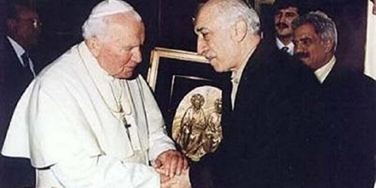 FETÖ Elebaşı Fethullah Gülen, 1998’de dönemin Papa’sı 2. Jean Paul ile baş başa görüştü. Fethullah Gülen’in yanındakiler, Papa’nın elini öptü. FETÖ, ABD istihbaratı CIA’nın başlattığı “dinler arası diyalog” projesi kapsamında, Papa ve Amerika’daki Evanjelist gruplar ile birlikte çalıştı.