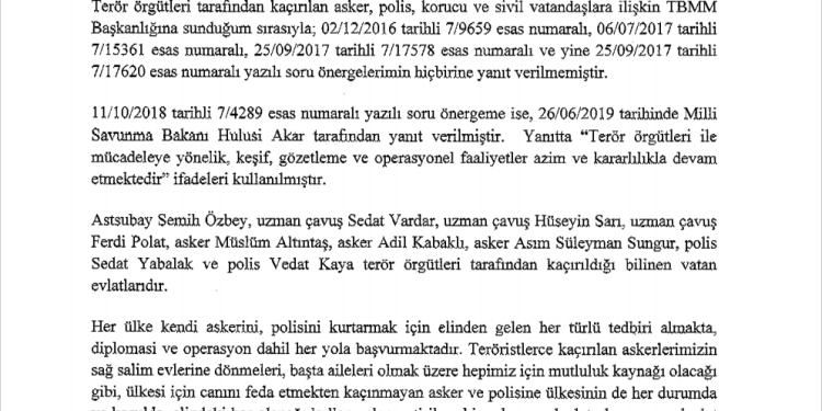 CHP’li Murat Bakan yazılı soru önergesinde kaçırılan askerlerin akıbetlerini,askerlerin kurtarılması için hangi kurtarma faaliyetlerinin yapıldığını ve IŞİD-PKK gibi terör örgütlerinin kaç asker,polis,korucu kaçırdığının bilinip bilinmediğini sordu.