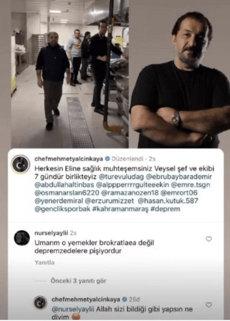 Bir takipçisi, Yalçınkaya’nın gönderisine “Umarım o yemekler bürokratlara değil depremzedelere pişiyordur” yorumunu yaptı.
