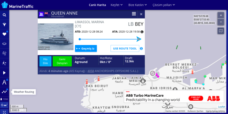 Geminin tüm hareketleri ve güzergahı Marinetraffic isimli sitede yer alırken teknenin İngiliz bandıralı olması dikkat çekti.