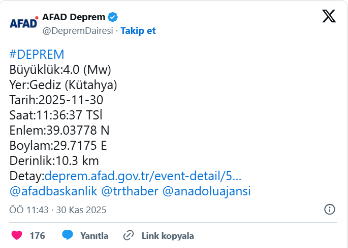 Afet ve Acil Durum Yönetmeliği Başkanlığı (AFAD), Kütahya’nın Gediz ilçesinde 4 büyüklüğünde bir deprem meydana geldiğini açıkladı.