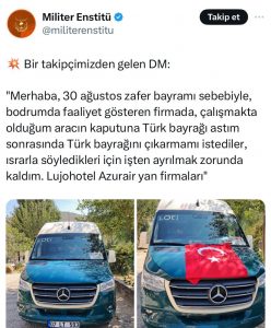 Dün X mecrasında “Militer Doktrin” isimli hesabın yaptığı bir paylaşımda ismi verilmeyen bir takipçinin DM mesajı yayınlanarak, mesajda Antalya’da faaliyet gösteren bir turizm firmasının araçlarından birisinin şoförünün 30 Ağustos Zafer Bayramı nedeni ile kullandığı aracın kaputuna Türk Bayrağı asması sonrası şirket sahiplerinin ısrarla bayrağı kaldırmasını istedikleri ve bunu kabul etmeyen araç sürücüsünün işinden ayrılmak durumunda bırakıldığı paylaşılmıştı. Aynı paylaşımda bu şirketin yan kuruluşlarının da Lojo Hotel ve Azur Air olduğu belirtilmişti.