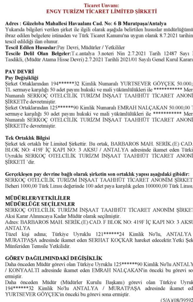 30 Ağustos’ta araç sürücüsüne bayrak astırmayan şirket Antalya merkezli ENGY TURİZM TİCARET LİMİTED ŞİRKETİ isimli firma. Bu firmanın sahibi ise SERKOÇ OTELCİLİK. Son pay devri ile birlikte ENGY TURİZM’in tek sahibi olan SERKOÇ OTELCİLİK adına şirketin yetki verdiği isim ise Serhat Koçkar.