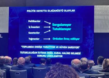 TÜSİAD'ın olağan genel kurulundaki 'Politik hayatta olağanüstü olaylar' başlıklı slaytında gazeteciler, iş insanları ve politikacılara yönelik baskılar ile Kara Harp ...