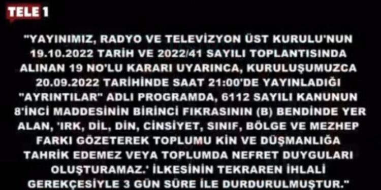 Radyo Televizyon Üst Kurulu (RTÜK), kürsü dokunulmazlığı bulunan TİP İstanbul Milletvekili Sera Kadıgil’in, Enver Aysever’in sunduğu Ayrıntılar programındaki ifadeleri nedeniyle TELE1’e üç gün süreyle ekran karartma cezası verdi.