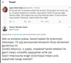 Bir sosyal medya kullanıcısının Hiranur Vakfı’ndaki tecavüze ilişkin paylaşımına yanıt veren Konya Uysal, “Aile vs. zorlama yoksa, kendi iradesi ile evlenmeyi istemişse, 13 yaş konusunda kimsenin itiraz etmemesi gerekmez mi? Çünkü biliyoruz, o yaşta, maalesef kendi istekleri ile gayri meşru cinsellik yaşayanlar artık var. Gayri meşrusuna engel olamayıp, meşru yolu kapatmak hangi mantık?” ifadelerini kullanmıştı.