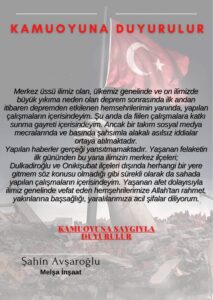SÖZCÜ’den Latif Sansür’ün haberine göre ; Kahramanmaraş’ta Doğukent bölgesinde AKP Dulkadiroğlu İlçe Başkanı Şahin Avşaroğlu’nun sahibi olduğu Melşa İnşaat tarafından yapılan 15 katlı üç bloktan ikisi depremde yıkılırken, bir blok ise ağır hasar aldı. Vatandaşların 6-7 ay önce taşındığı 140 konutluk Badı Saba Konutlarında yüzlerce kişi hayatını kaybetti. Avşaroğlu ise hiçbir şey olmamış gibi yaşamına devam edince, her iki blokta hayatını kaybedenlerin yakınları isyan etti. SÖZCÜ’ye konuşan acılı aileler, “Yasımızı tuttuk, artık hak aramak istiyoruz” diyerek AKP’li ismin tutuklanmamasına isyan etti.