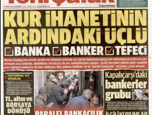 Yandaş Yeni Şafak Gazetesi tam sayfa olarak verdiği haberde bazı bankaların ve banka üst düzey görevlilerinin organize biçimde dolar stokçuluğu yaparak piyasaları manipüle ettiklerini, “Kura saldırı düzenlediklerini” iddia etti.